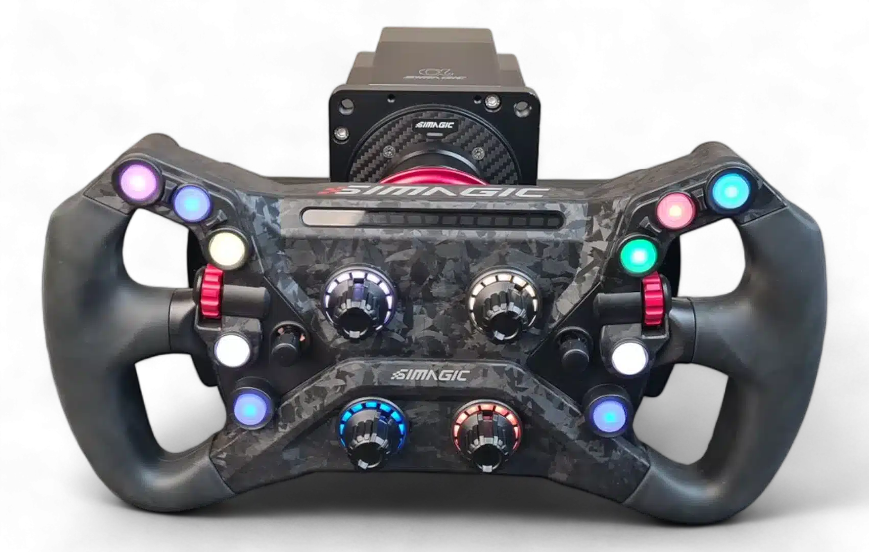 The Simagic Alpha integrates the new generation of Simagic wheels within its bundles: choose between GT4 and GT1 according to your needs, and live a complete and realistic simulation experience, thanks to the quality of the materials used, respectively carbon fiber and Alcantara. The buttons are backlit, perfect for your sessions at night!